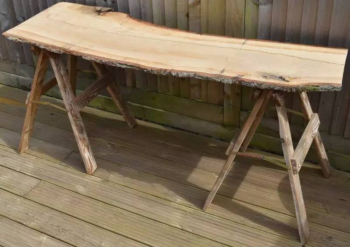 Rustic bark edged plank on two rustic trestle legsApprox length 6ft, Width varies