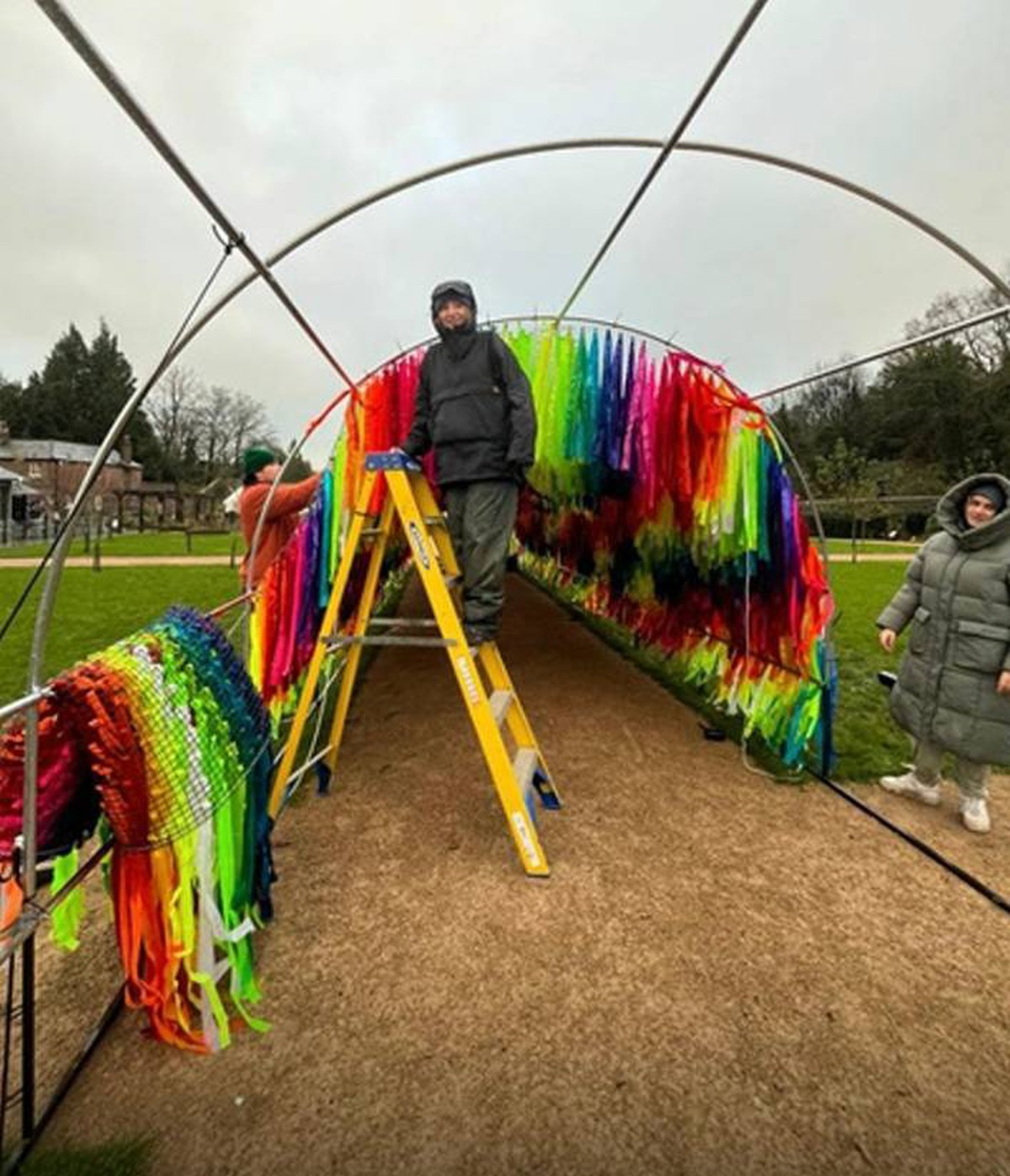 The installation comes with bespoke footings, made in steel that are weighted and pegged into grass ( outside) OR free standing ( with sand bags) if inside.If outside additional guy ropes are attached to the polyt unnel frame and then pegged into the ground with ground stakes.