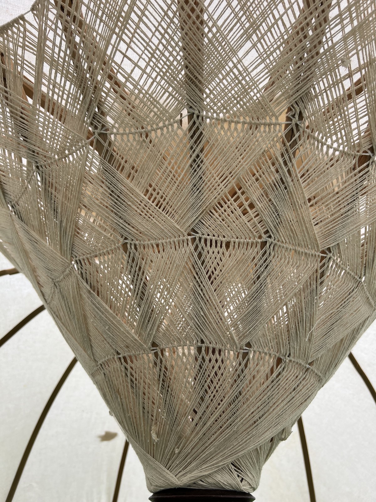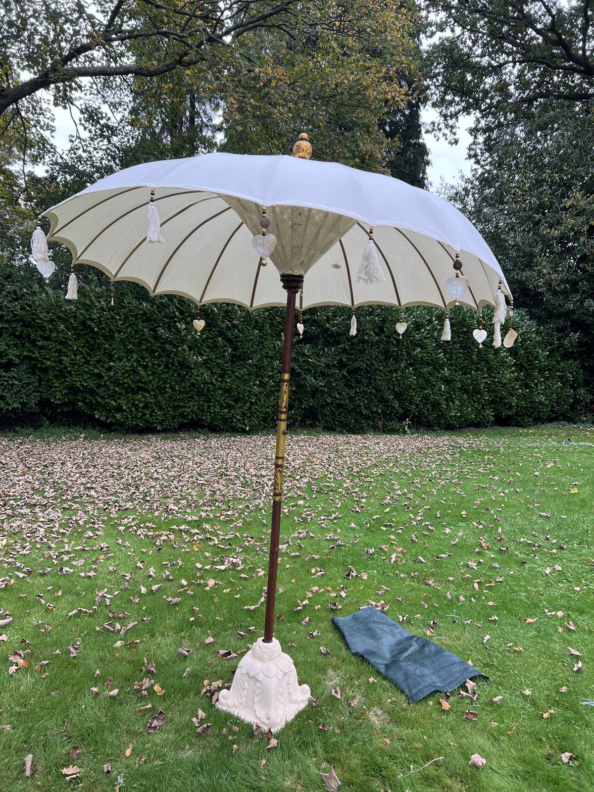 Beautiful hand-made garden parasols from The Paradise Collection, crafted in Indonesia.Each parasol is finished in a soft ivory colour and comes complete with a stone-carved base from The Indian Garden Company. Used on a handful of Asian weddings, these parasols remain in lovely condition with only minor cosmetic wear — a few small emblems showing light damage.