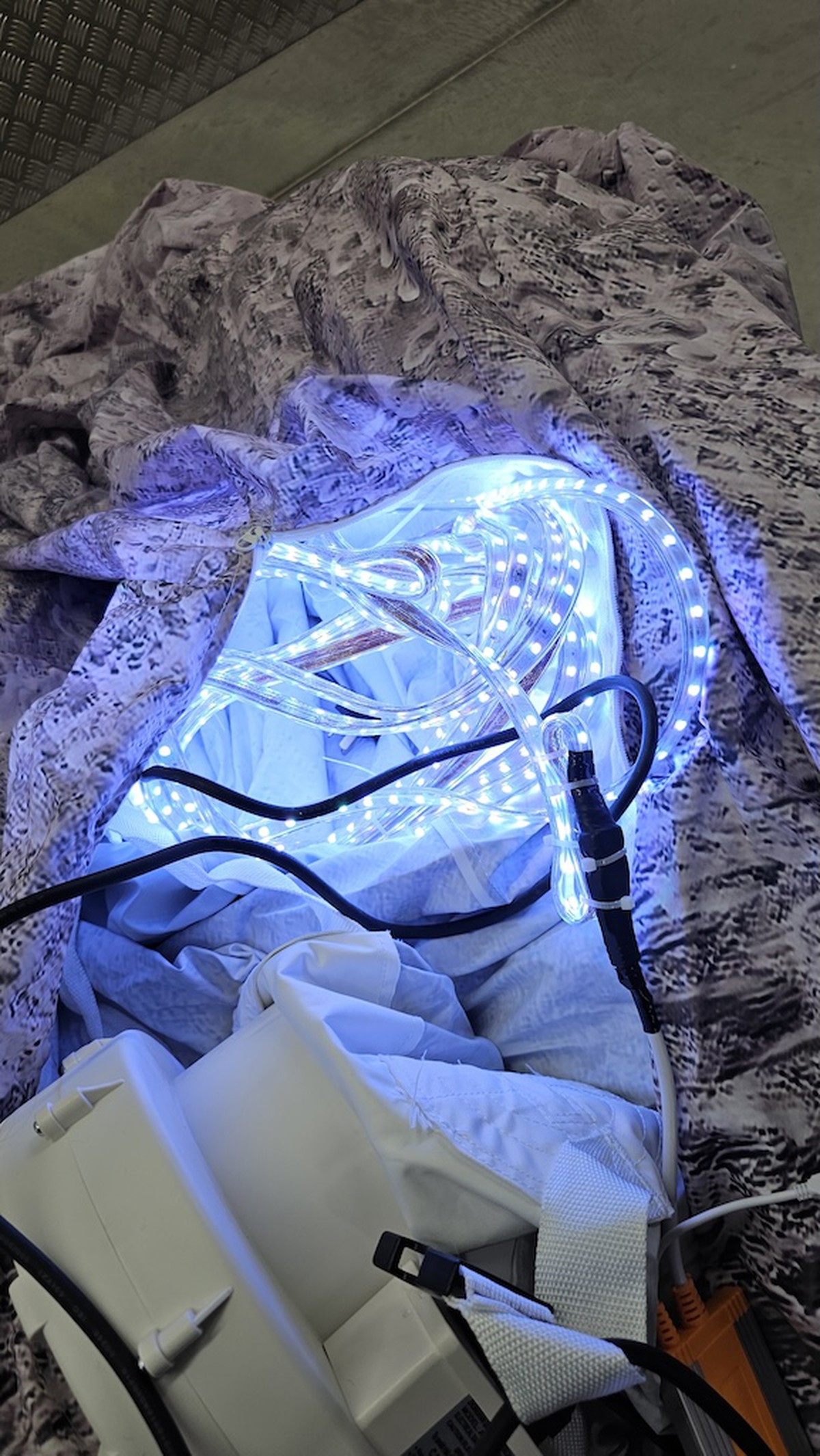 Requires standard 13 amp plug to power the inflation fan and lighting. Currently has euro plugs fitted as it was produced for an event in Europe, will include UK adapter plugs.
