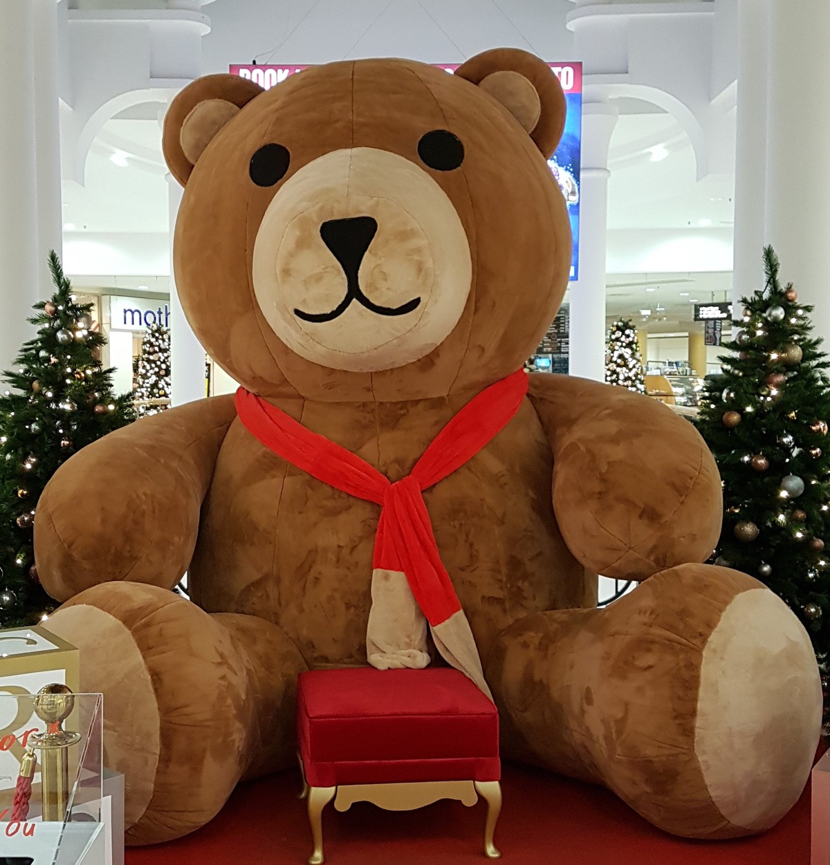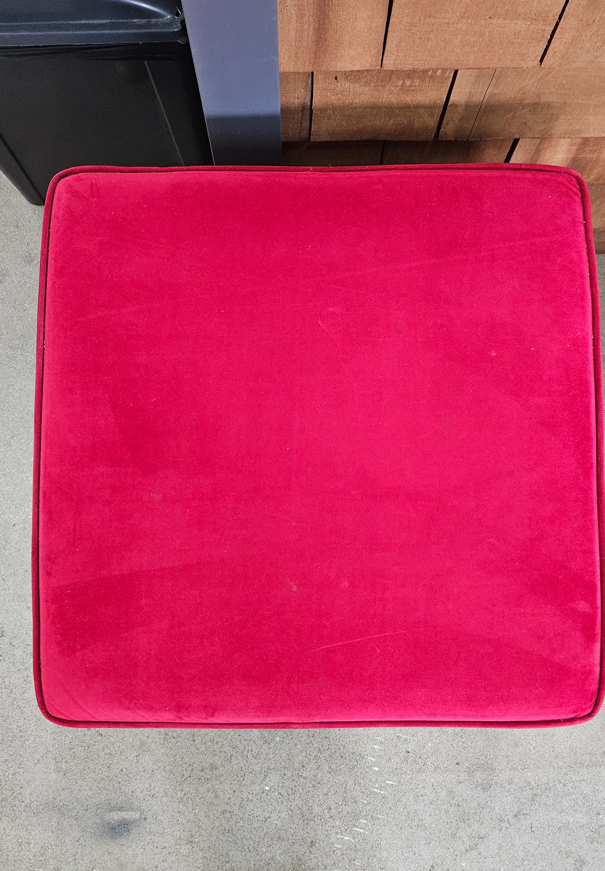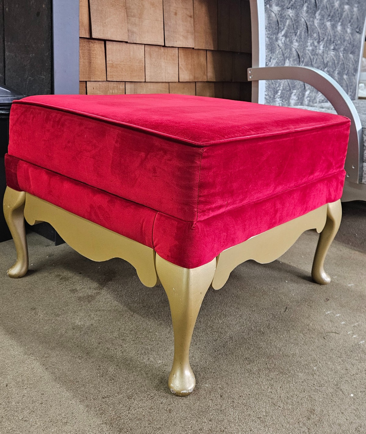 Red stool used for selfie Christmas display in front of giant inflatable teddy bear (teddy bear not included) but stool could be used for similar type of display.Wooden frame with red velvet upholstery.