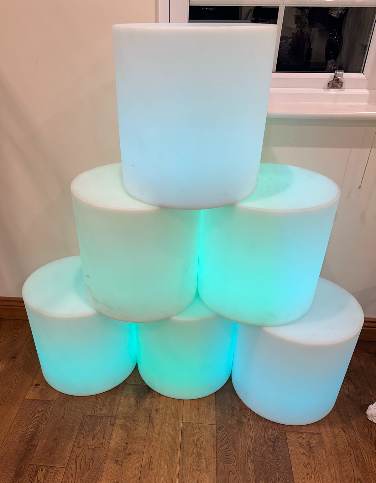 4x 40cm x 40cm Led Light up cubes with leads and remotes10x led cylindrical stools with leads and remotes
